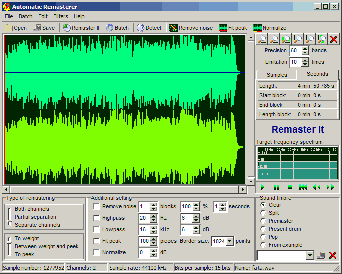 Program is using for all calculation 32 bit representation of sound, which warrants dynamics of 240 dB in integer numbers and till 1667 dB in floating point numbers. This warrants after conversion back to output 16 bit format non-measurable calculation losses. Also frequencyprocessing through FFT (FAST FOURIER TRANSFORMATION) with block size 16384 samples on channel warrants high frequency accuracy. Method of noise autodetection noise requires that recordings consist of at least one place only with noise about length at least one second, otherwise it can reach the removal of also other sounds than noise so damage recordings. Unfortunately I am not conscious of that, that at present it subsists method of detection noise from sample, where there are not places with noise in clear form. Diferently from most of the programs there is not a need to search noise manually and the program finds noise. Due to 32 bit processing there is no possibility to "overburn" the signal, if peaks exceed behind borders of normalized signal, there're not otherwise displayed, but after normalization of signal they are back available distortionless. If you however sample save with overrun peaks,they will be cutted.
